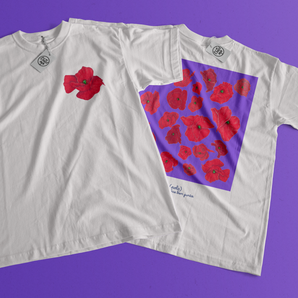 Flor Amapola en el escudo con estampado completo en la espalda, acompañado de un juego de palabras mostrando su significado «Consuelo de sentirse bien juntos».