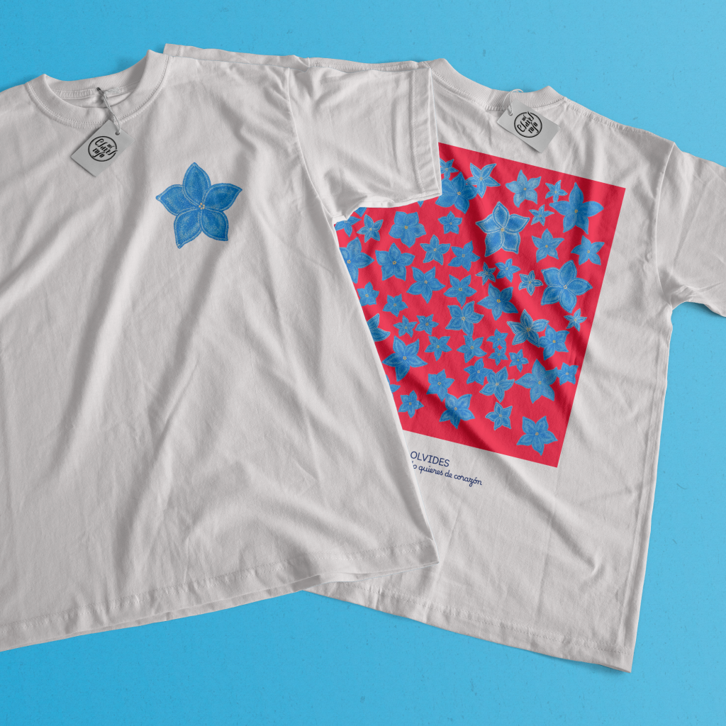 Flor Nomeolvides en el escudo con estampado completo en la espalda, acompañado de un juego de palabras mostrando su significado «Acto imposible cuando quieres de corazón».